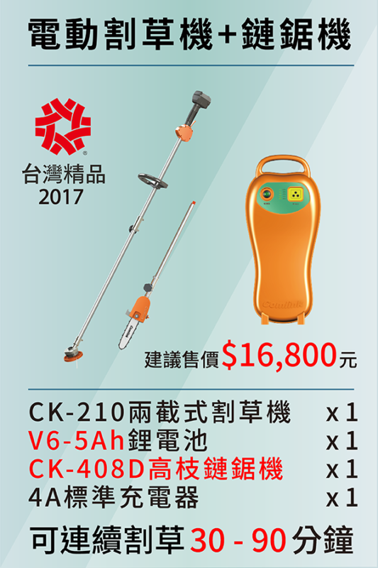 - 全台第一支通過台灣農機認證的電動割草機