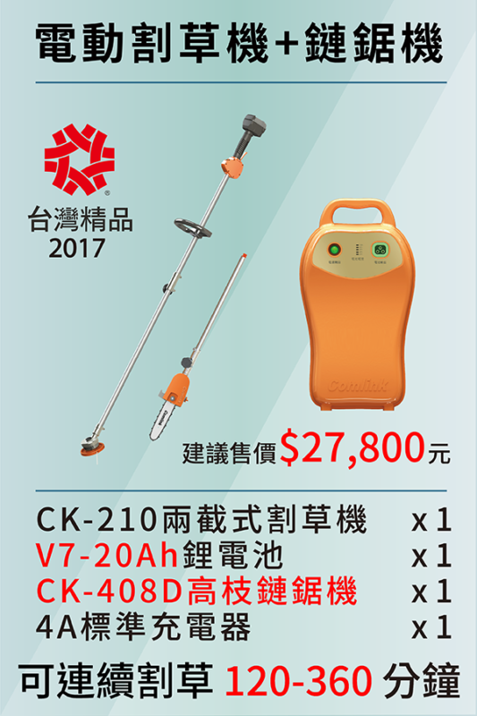 - 全台第一支通過台灣農機認證的電動割草機